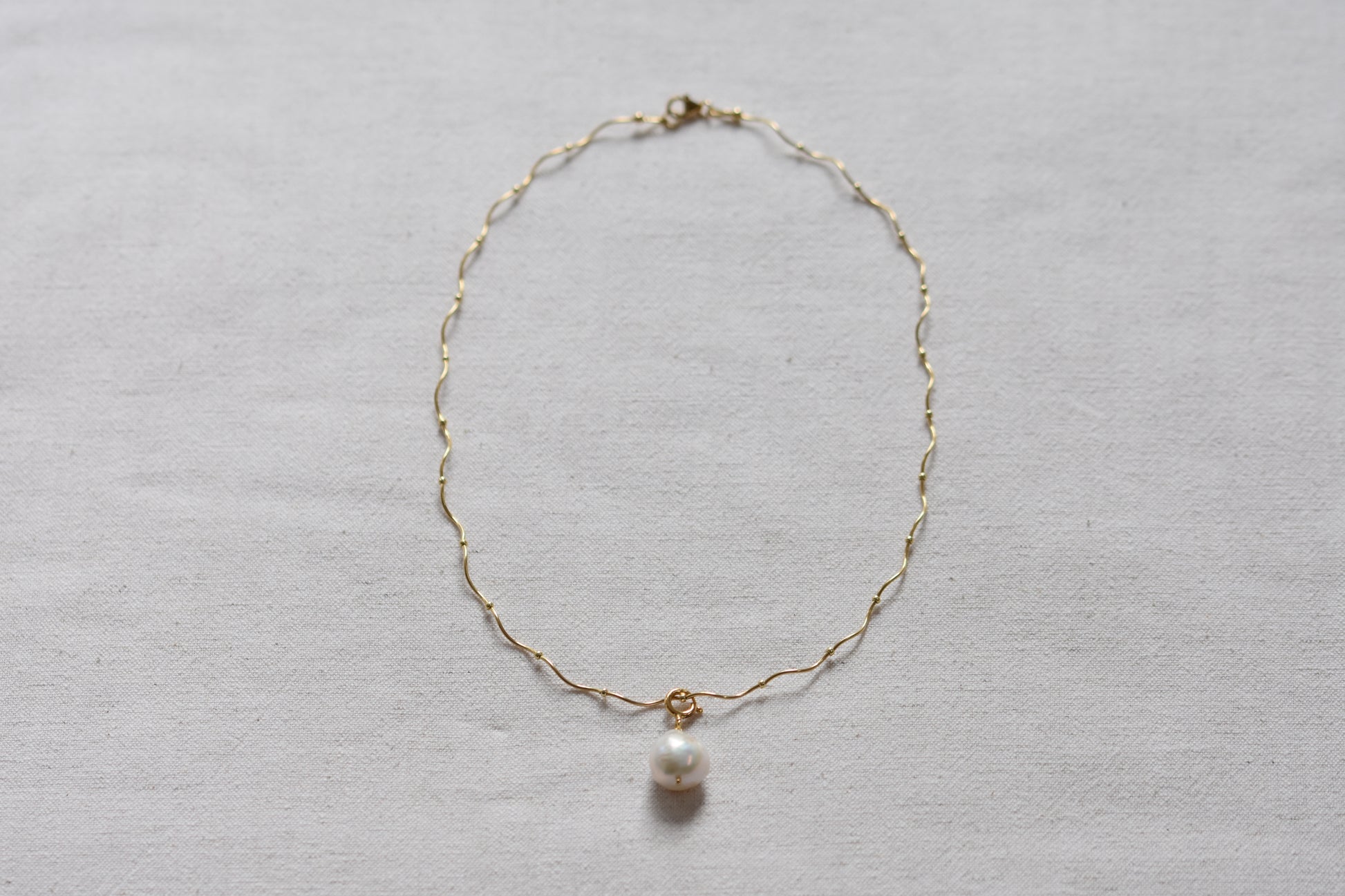 A classic baroque pearl charm with gold vermeil bail, on a circle of wavy gold-filled ripples, with Miyuki beads and a gold-filled clasp. Gold-fill is longer lasting than gold plate and will keep its colour for 10-30 years when treated with care. The baroque pearl charm is removable for the perfect versatile piece.